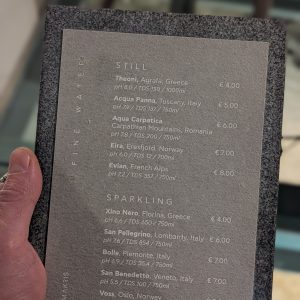 Πίσω στη χώρα μας και τη γαστρονομική της σκηνή, για την οποία, θέλω να σας πληροφορήσω πως εδώ και μερικά, λίγα χρόνια, έχει κι αυτή ένα εστιατόριο με ξεχωριστό μενού εμφιαλωμένων νερών, μια αυτόνομη λίστα την οποία παραλαμβάνετε με το που καθίσετε στο τραπέζι σας. Για την ακρίβεια, είναι το πρώτο πράγμα που θα κληθείτε να παραγγείλετε, το πρώτο πράγμα που θα επιλέξετε να συνοδεύσει το δείπνο σας.